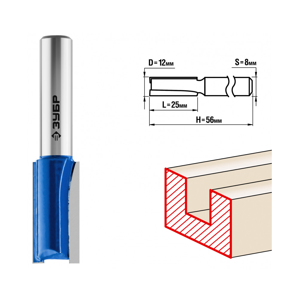Фреза пазовая прямая,D-12мм dl-25мм, хв.-8мм,ЗУБР Проф.