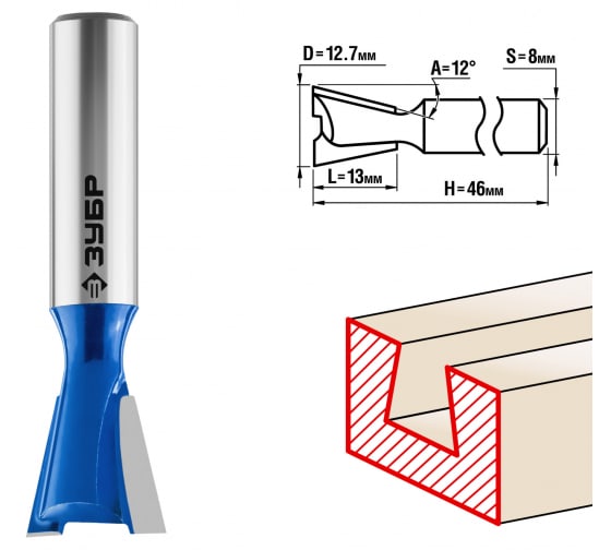 Фреза пазовая фасонная"Ласточкин хвост",D-12,7мм dl-13мм, хв.-8мм,обр.уг.-12 град. ЗУБР Проф.