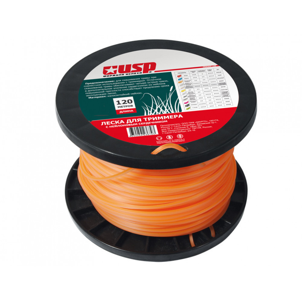 Леска для триммера с нейлоновым сердечником, длина 120 м, профиль - квадрат, диаметр 3.0 мм