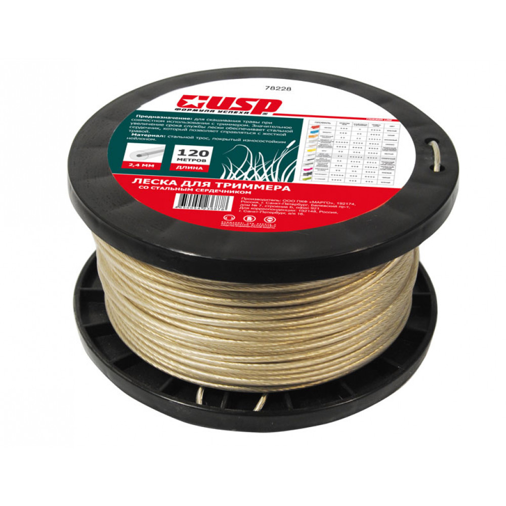 Для скашивания травы при совместном использовании с триммером. Значительное увеличение срока службы лески обеспечивает стальной сердечник, который позволяет справлятся с жесткой травой. Материал: стальной трос покрытый износостойким нейлоном.
