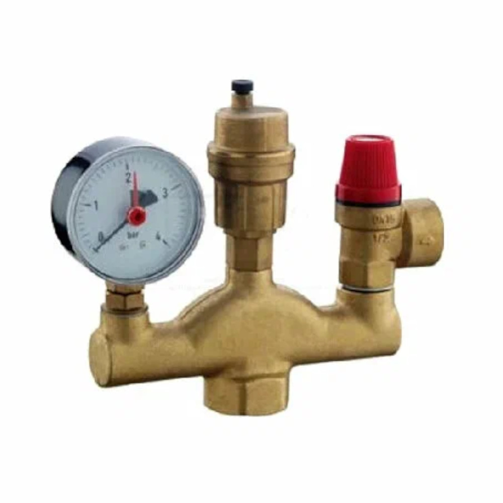 Группа безопасности котла. ВР, латунная F285.06 — латунная конструкция, которая состоит из предохранительного клапана с настраиваемым диапазоном максимального давления, автоматического поплавкового воздухоотводчика, обратного клапана и манометра.