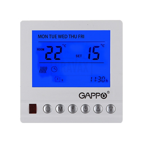 Комнатный термостат отключает нагрев системы по мере необходимости. Он работает путём измерения температуры воздуха, и включения отопления, когда температура воздуха падает ниже установки термостата, и его выключения, когда установленная температура будет достигнута