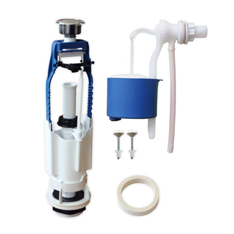наливной механизм – 1 шт.;сливной механизм – 1 шт.;круглая двухрежимная смывная кнопка, цвет: хром – 1 шт.;гайка с уплотнительным кольцом для фиксации впускного штуцера – 1 шт.;комплект для крепления бачка к чаше унитаза – 1 шт.;прокладка для уплотнения стыка между бачком и чашей унитаза – 1 шт.;паспорт и инструкция по монтажу и эксплуатации – 1 шт.