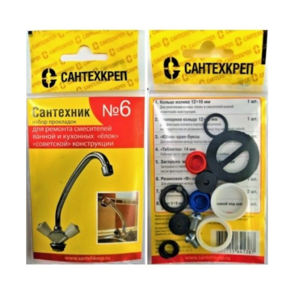 Ремкомплект "Родничок"(елка) Сантехник №6 подходит для отечественных смесителей «Ёлочка». включает в себя элементы смесителя, которые могут выйти из строя под действием высоких нагрузок. Как правило, это происходит с уплотнителями. Также в нём содержатся элементы, которые могут потребовать замены из-за утери или потери внешнего вида: кнопки указателей воды крепления и т.д.