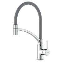 Смеситель для кухни с гибким изливом, серый/хром FRAP F4552. Смеситель оборудован встроенным аэратором, обеспечивающим равномерный поток струи. Преимущество смесителя заключается в гибкости излива и самостоятельной регулировки его высоты. Благодаря гибкому изливу с лейкой появляется возможность направлять поток воды в нужные части мойки, а также без трудностей набирать высокие емкости водой. Тип картриджа – керамический картридж 35 мм. Тип крепления – гайка. Материал корпуса – латунь.