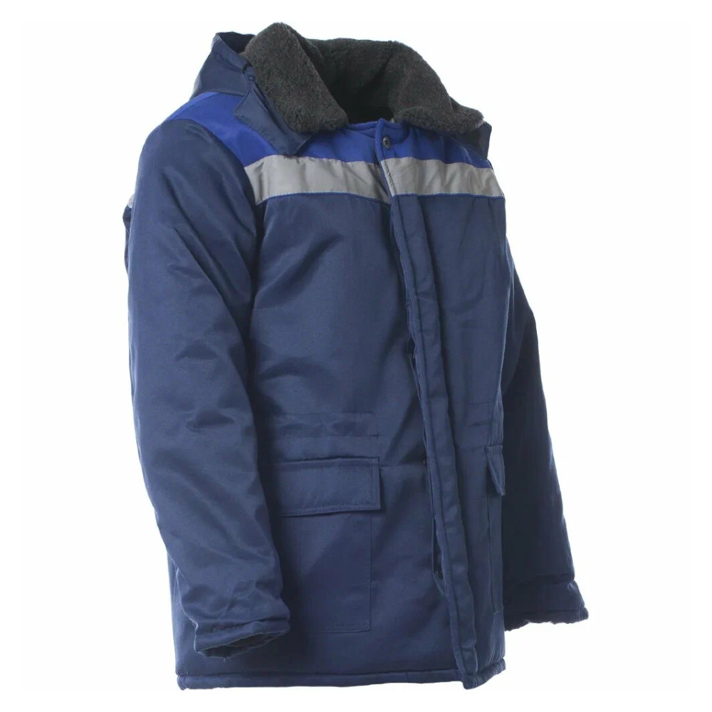 Куртка утеплённая мужская «БРИГАДИР» цв. т.синий, васильковый (48-50) 96-100/182-188 прямого силуэта, с притачной утеплённой подкладкой, с центральной потайной застёжкой на 4 пуговицы и 1 сквозную петлю и пуговицу, с внутренней утеплённой ветрозащитной планкой. А также, по линии талии кулиска со шнуром с фиксаторами и наконечниками. Воротник отложной утеплённый, верхняя часть воротника из искусственного меха чёрного цвета. Воротник фиксируется в поднятом положении с помощью хлястика, застёгнутого на петлю и пуговицу. Рукава двухшовные, с внутренними трикотажными манжетами.
