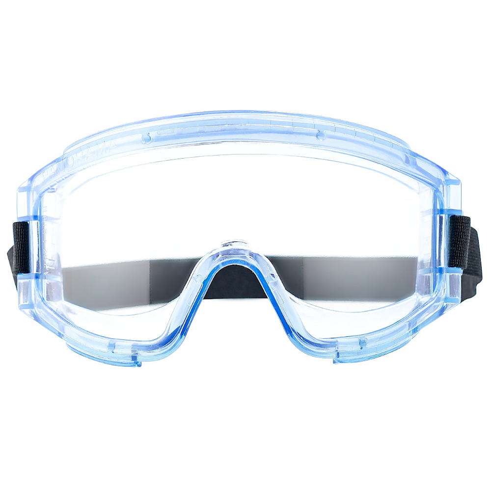 Очки с панорамным защитным стеклом из прозрачного материала РС super с двусторонним незапотевающим покрытием, устойчивым к истиранию и царапанию, защита глаз от высокоскоростных летящих частиц со среднеэнергетическим ударом.