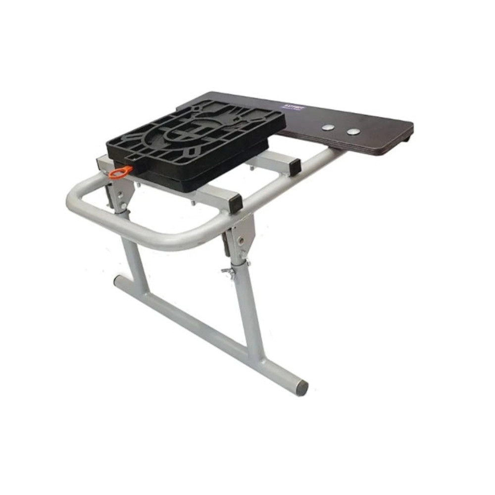Опора регулируемая на лтр с поворотным механизмом под сидение с бортовым креплением в надувную лодку, изготовлена из стальной трубы. Основание закрепляется при помощи заранее приклеенных к баллонам лодки креплений — шайб леера.