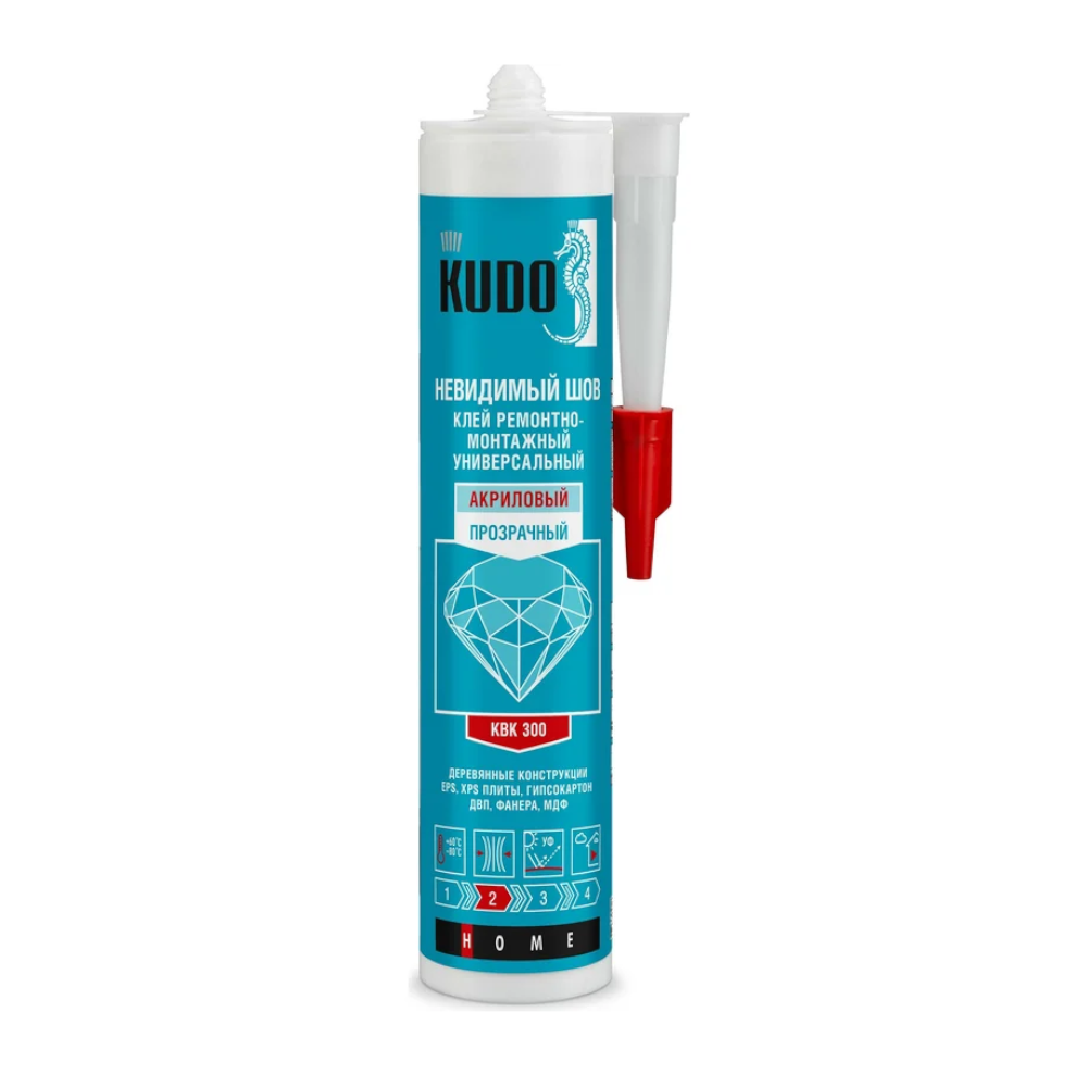 Клей монтажный KUDO невидимый шов акриловый прозрачный 280 мл специально разработан для приклеивания изделий из древесины, ДСП, ДВП, EPS, XPS и UPVC на бетонные, кирпичные, каменные, металлические, оштукатуренные и деревянные поверхности.