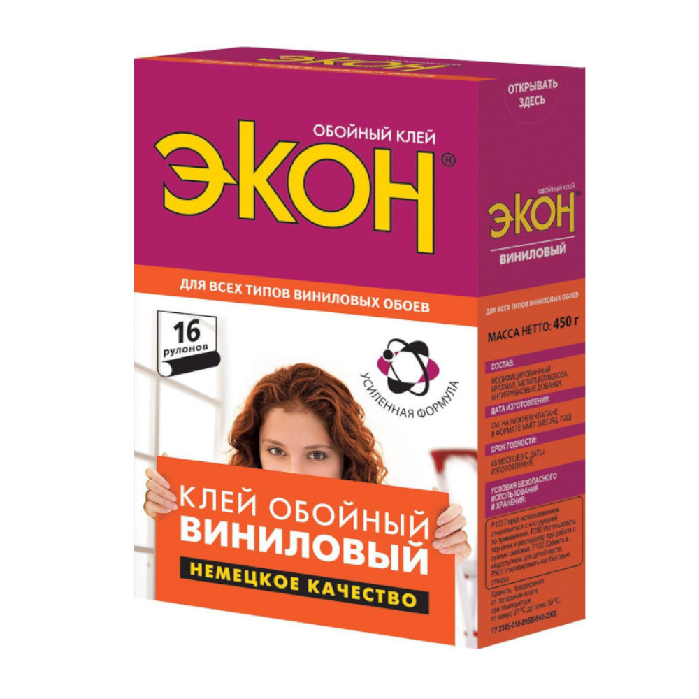 Обойный клей ЭКОН Виниловый, 450 г. Состав: Модифицированный крахмал, метилцеллюлоза, противогрибковые добавки. Предназначен для наклеивания всех видов виниловых обоев, вспененного винила, шелкографии. Высококачественный, быстрорастворимый клей на основе метилцеллюлозы, модифицированного крахмала, антигрибковой добавки. Производитель - ООО "Хенкель Рус".