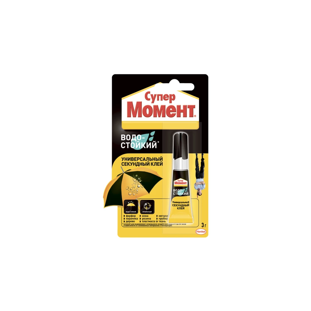 Супер Момент водостойкий отлично склеивает широкий спектр материалов. Это надежный и стойкий прозрачный секундный клей, особо устойчивый к воздействию воды и растворителей. Выдерживает прямое воздействие воды в течение 3-24 часов. Не пригоден для склеивания полипропилена, полиэтилена, политетрафторэтилена (тефлона), стекла, глазированных поверхностей и силиконовой резины. Также не пригоден для склеивания очень мягкой кожи. Не применим для склеивания посуды, в которую будет наливаться горячая жидкость и посуды, которая может контактировать с пищей.
