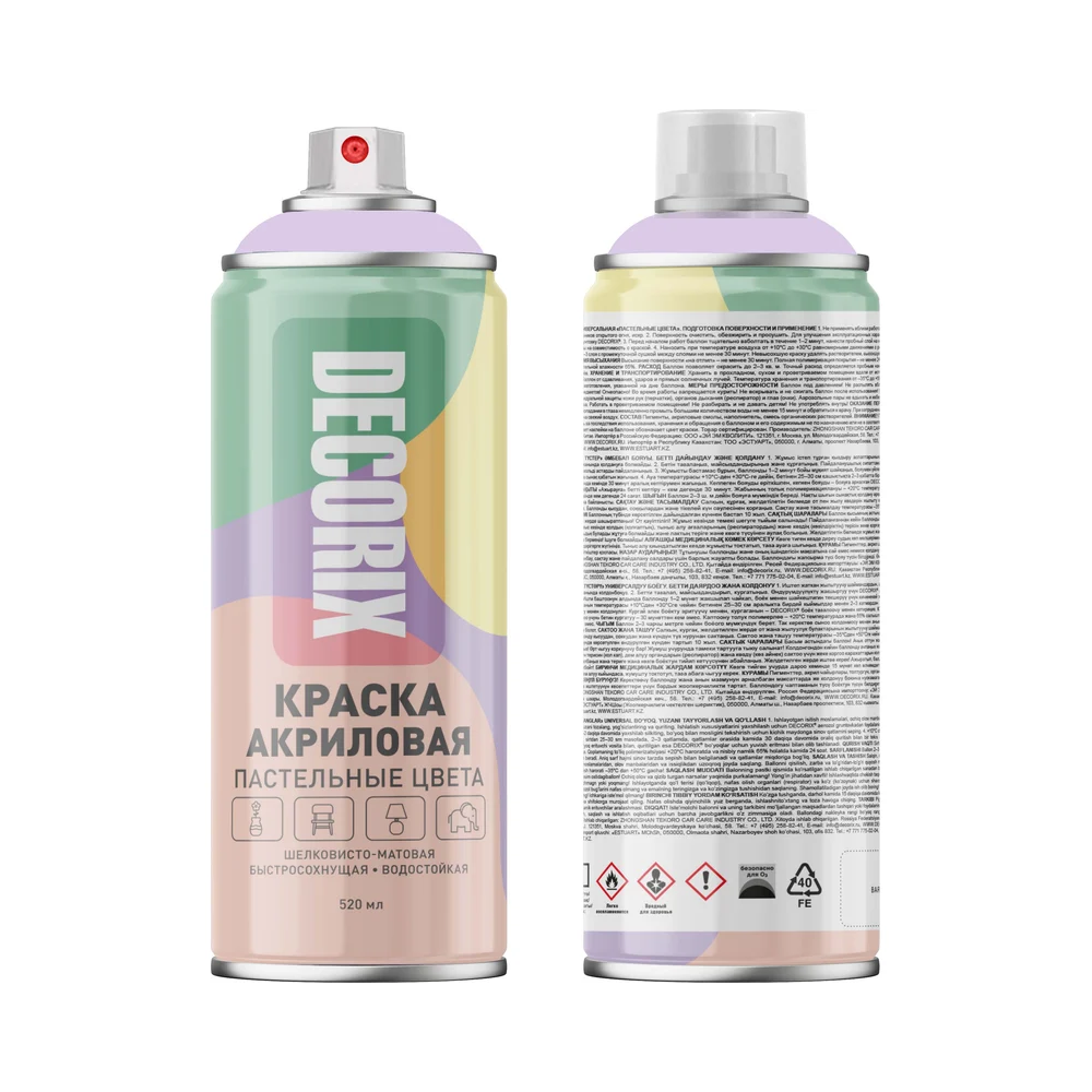 Краска аэрозольная универсальная, пастельные цвета DECORIX, 520 мл, пастельный фиолетовый. Краска идеально подходит для декорирования и реставрации мебели, фоторамок, шкатулок, цветочных горшков, панно, художественного литья, кованных металлических изделий и других предметов интерьера выполненных из керамики, древесины, металла, камня, стекла и некоторых видов пластмасс.