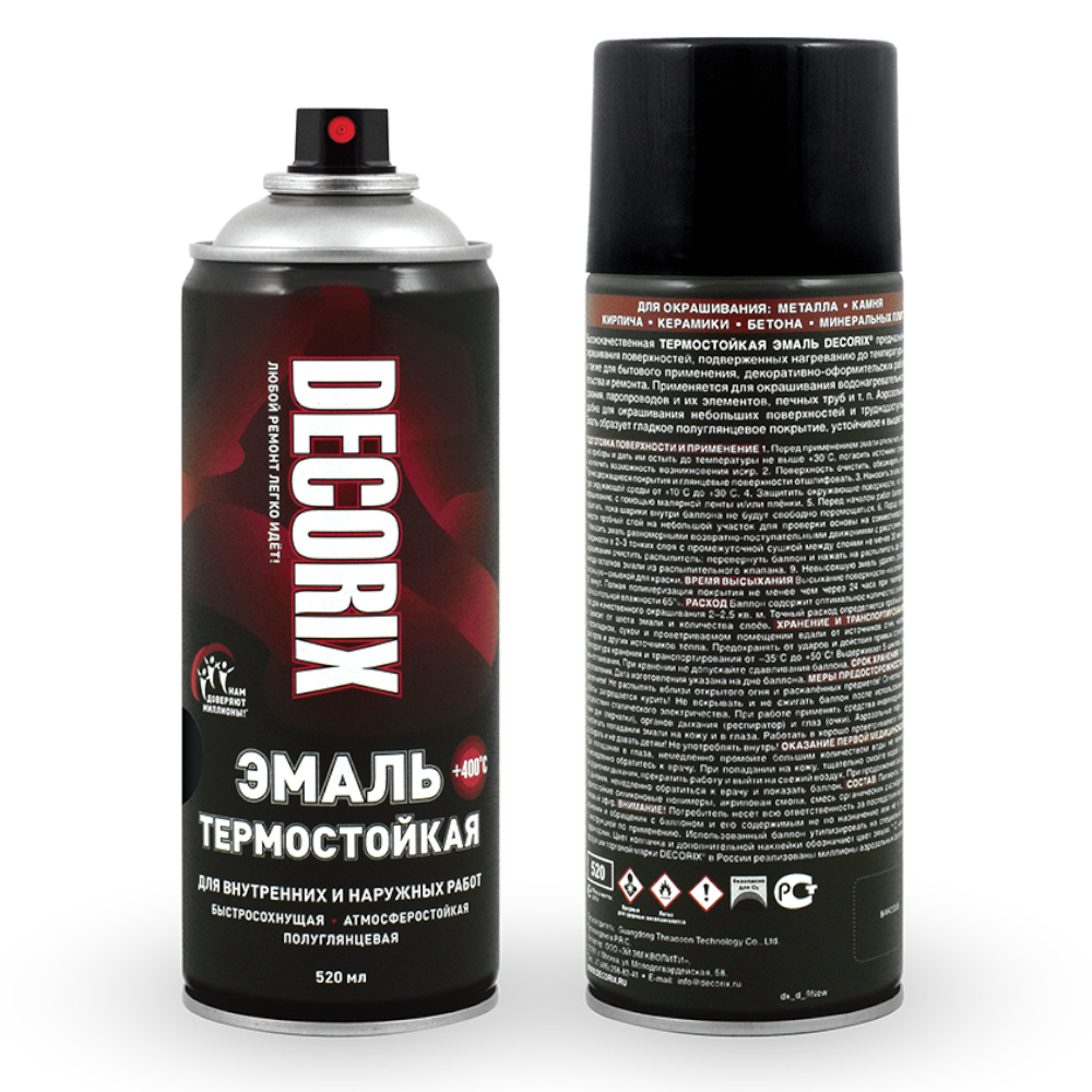 Высококачественная термостойкая эмаль DECORIX предназначена для окрашивания поверхностей, подверженных нагреванию до температуры +400°С, а также для бытового применения, декоративно-оформительских работ, строительства и ремонта.