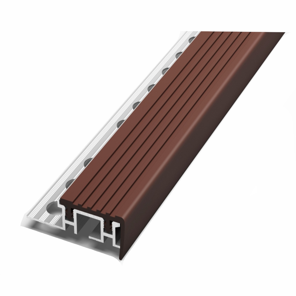 Алюминиевый профиль ПУ 10-1. Внешний угол (накладка на ступень), 34.8 х 12.5 мм. C ПВХ накладкой против скольжения и как элемент грязезащиты.Способ монтажа: устанавливается до момента укладки напольного покрытия на ступень, так как невидимая алюминиевая основа закладывается под напольное покрытие. Предназначен для защиты грани ступени.
