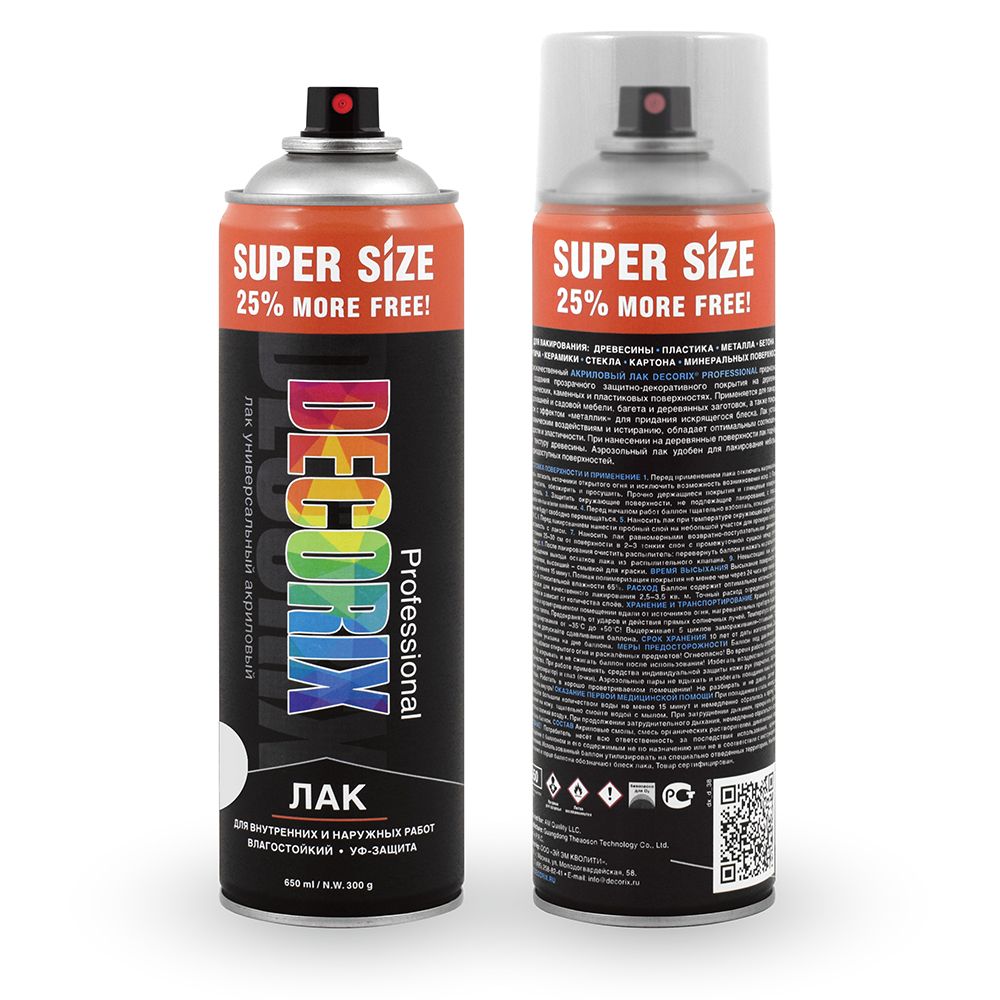 Высококачественный акриловый лак DECORIX® Professional предназначен для создания прозрачного защитно-декоративного покрытия на деревянных, металлических, каменных и пластиковых поверхностях. Применяется для лакирования домашней и садовой мебели, багета и деревянных заготовок, а также покрытия красок с эффектом «металлик» для придания искрящегося блеска. Лак устойчив к механическим воздействиям и истиранию, обладает оптимальным соотношением твёрдости и эластичности. При нанесении на деревянные поверхности лак подчёркивает текстуру древесины. Аэрозольный лак удобен для лакирования небольших и труднодоступных поверхностей.