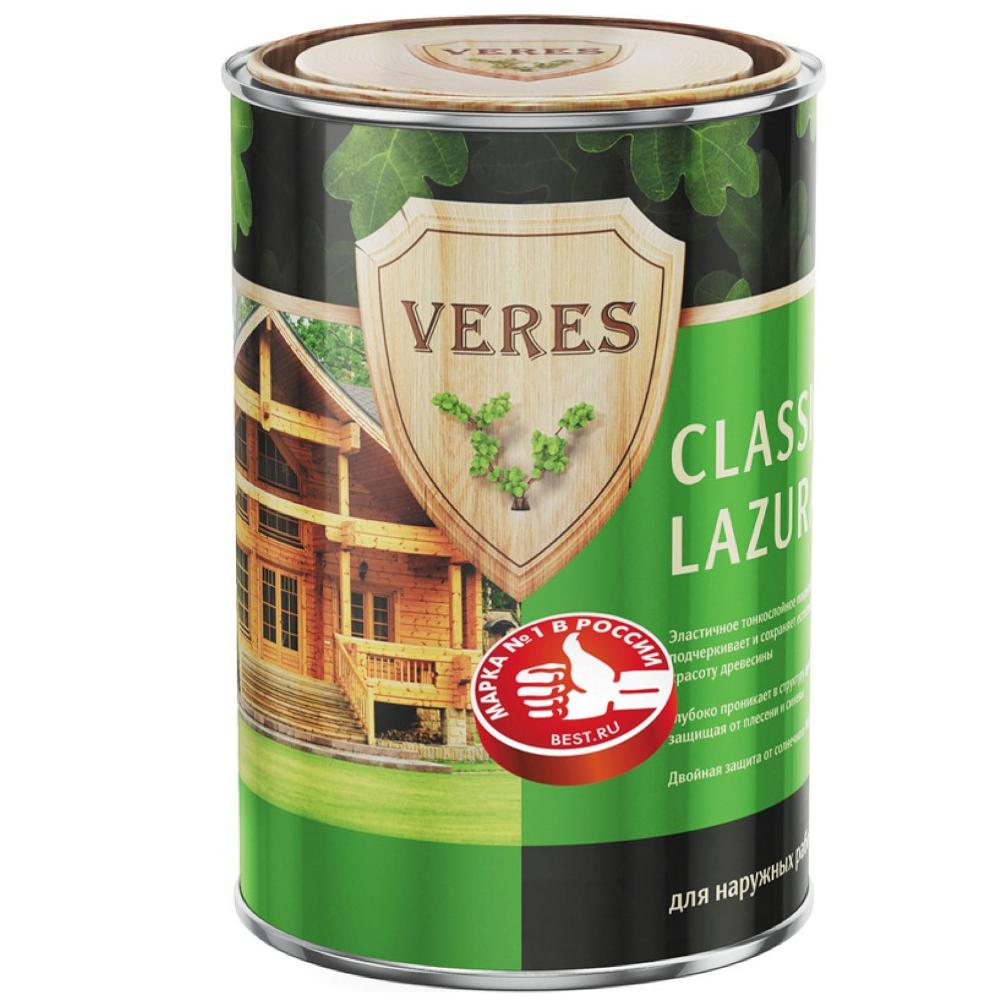 Надежная защита от УФ — излучения и атмосферных влияний Тиксотропная — не капает с кисти и не образует подтеков. Удобна в нанесении Натуральные масла и воски в составе обеспечивают гидрофобность и пониженное грязеудержание Срок эксплуатации покрытия до 10 лет (в системе отделки с грунтовочным составом Veres Base)