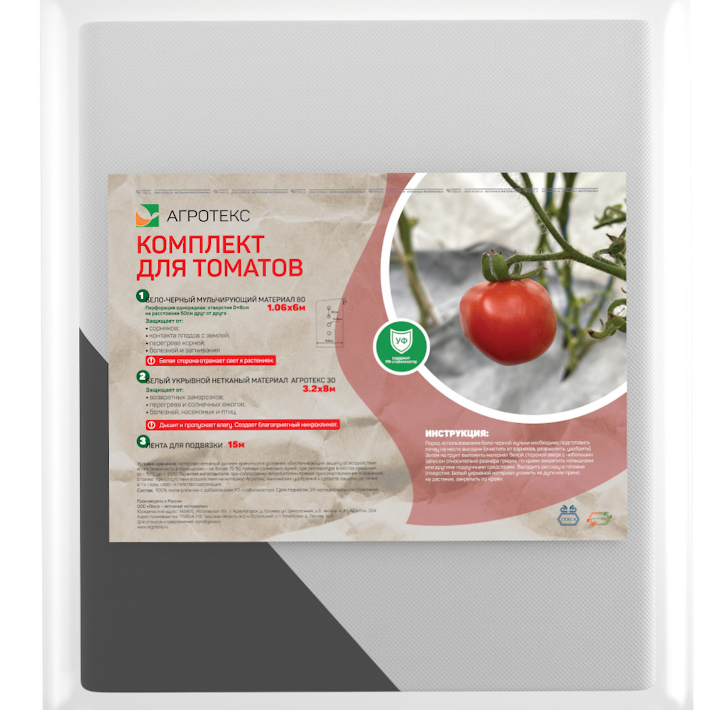 Применяется в открытом грунте и теплицах для мульчирования, укрытия и подвязки томатов. Помогает вырастить ранний урожай, сэкономив при этом на прополке. Защищает рассаду от возвратных заморозков, перегрева, ожогов и сорняков, а плоды – от соприкосновения с почвой. Верхний белый слой мульчи «Агротекс 80» отражает прямые солнечные лучи, не давая растениям и плодам перегреться и получить ожоги, а нижний чёрный – не пропускает свет и не даёт сорнякам развиваться. Лёгкий укрывной материал «Агротекс 30» можно применять без дуг, по мере роста растения самостоятельно поднимут полотно, не повредив при этом стебли и листья. Он помогает пережить возвратные заморозки и жаркую погоду, выполняет функцию барьера для насекомых, лягушек и птиц. Материал «дышит» и пропускает влагу, не допускает выпревания, гнили и других болезней. Благоприятный микроклимат ускоряет рост и стимулирует плодоношение. Ленты для подвязки берегут стебли от перегибов и поломок. Они изготовлены из прочного дышащего материала, который не перетягивает стебель растения, пропускает, но не задерживают влагу, исключая гниение в месте привязи. Благодаря этому комплекту удаётся не только получить урожай раньше на 5-10 дней и обойтись без прополки на протяжении всего сезона, но и извлечь дополнительную выгоду с продажи плодов отличного товарного вида. При этом издержки тоже заметно сокращаются: не придётся покупать растения, ведь потерь удастся избежать; больше не нужно бороться с сорняками, тратя время и дополнительные средства на химию; объём воды для полива тоже уменьшается, так как влага меньше испаряется из-под материала. Вносить удобрения можно поверх мульчирующего материала. Обработка химическими средствами не рекомендуется. Для удобства высадки в мульчирующем полотне предусмотрены готовые отверстия для высадки растений - перфорация однорядная (посадочные лунки расположены на расстоянии 50 см друг от друга). Внешний вид, цветовая гамма, технические характеристики товара и комплектность могут отличаться от реальных,уточняйте сведения на момент покупки и оплаты.