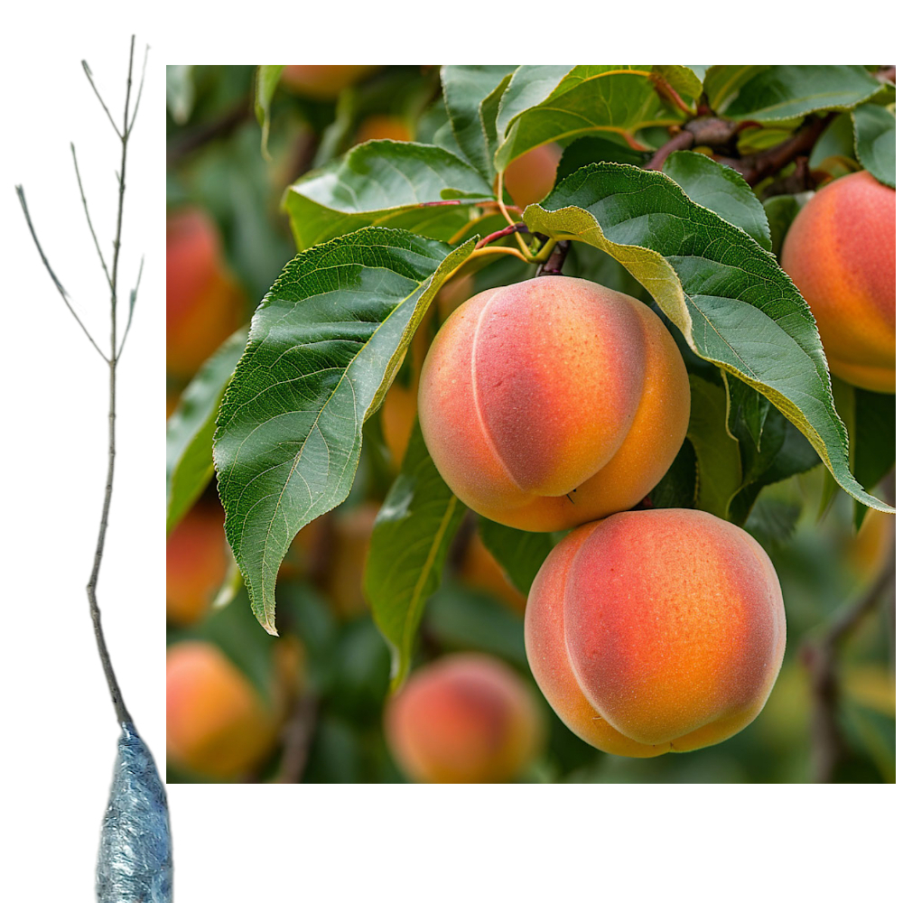 Плоды средние, округлой формы, желтые с бордовым румянцем, опушенные. Вес до 150 гр. Вкус кисло-сладкий, с преобладанием сладости. Косточка плохо отделяется от мякоти. Плодоношение в конце августа. Самоплодный.