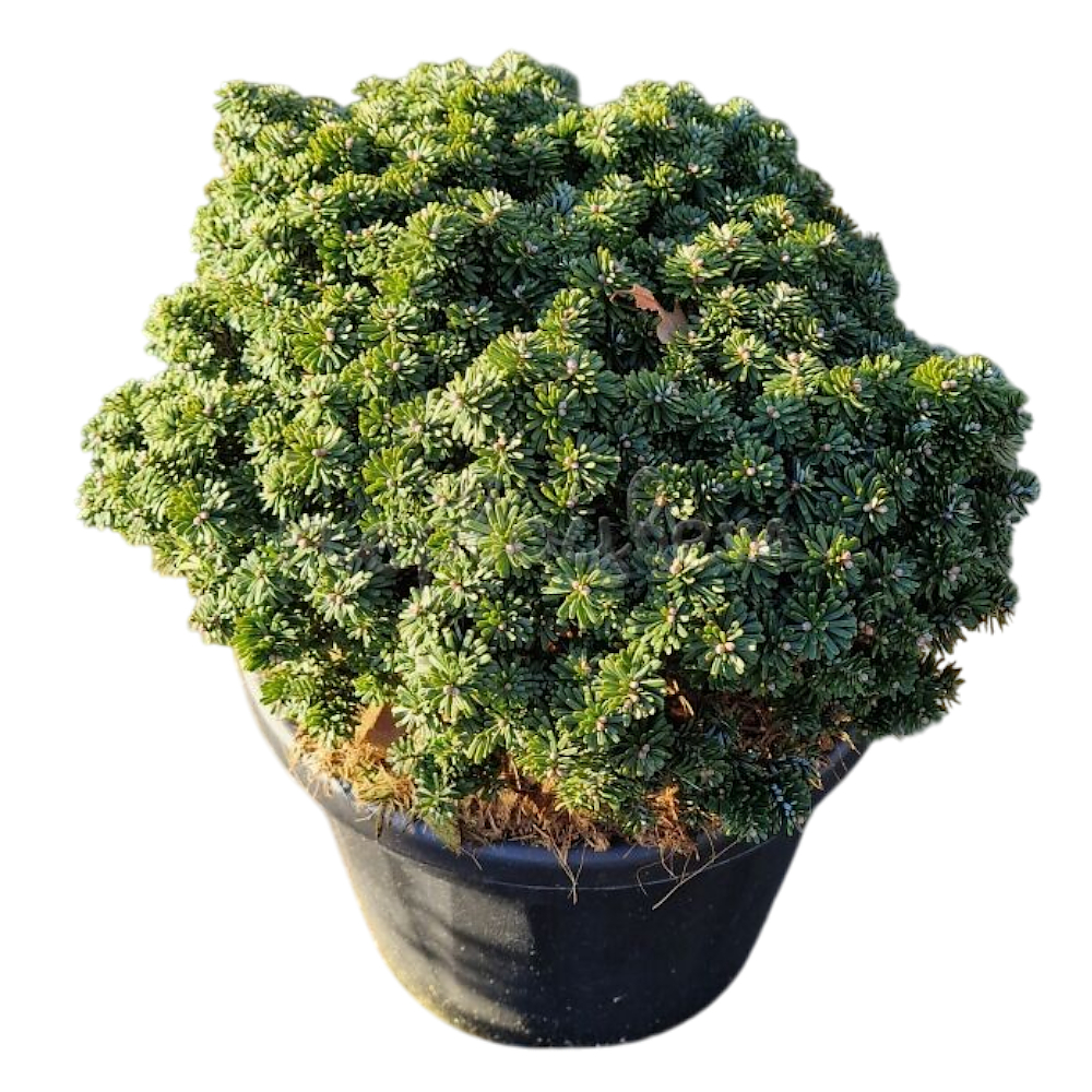 Высокодекоративный карликовый сорт. Крона как правило округлая, диаметром до 70 см, хотя встречаются экземпляры с ширококонической кроной. Хвоя плотная, ароматная, длиной до 2 см, с немного загнутыми краями, сверху зеленая, снизу с серебристо-голубыми полосочками. Шишки растут вертикально, молодые - синевато-зеленые или лиловые, более взрослые - коричневые.
