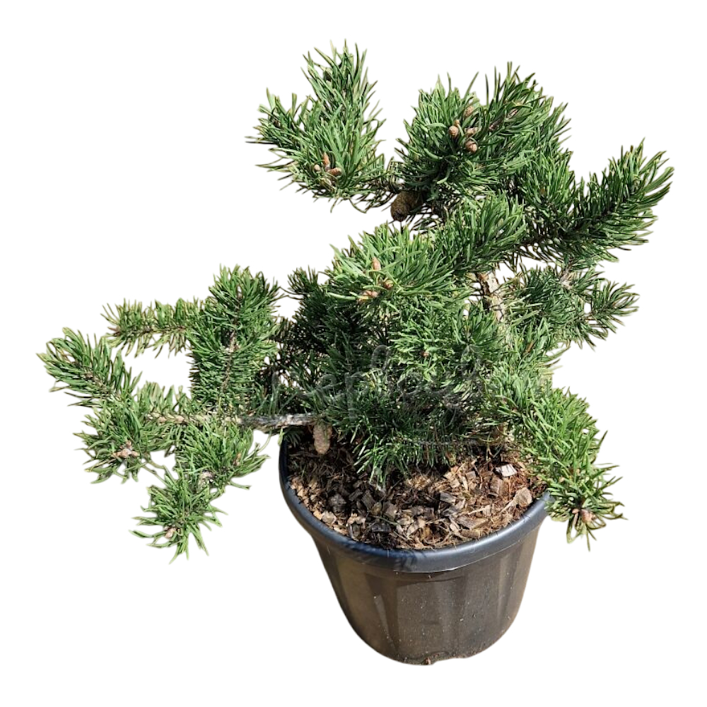 Сосна имеет интересную форму кроны - растопыренные ветки образуют стелющуюся неправильную форму кроны, что придаёт растению определенного шарма. Игольчатая блестящая хвоя тёмно-зелёного цвета дополняет облик растения. Цвет у хвои не меняется круглый год. Новые побеги имеют вид свечек, что придаёт растению ещё большую декоративность. Достигает в высоту 1 метр. Предпочитает солнечные места с лёгкими дренированными почвами. Обладает хорошей зимостойкостью.