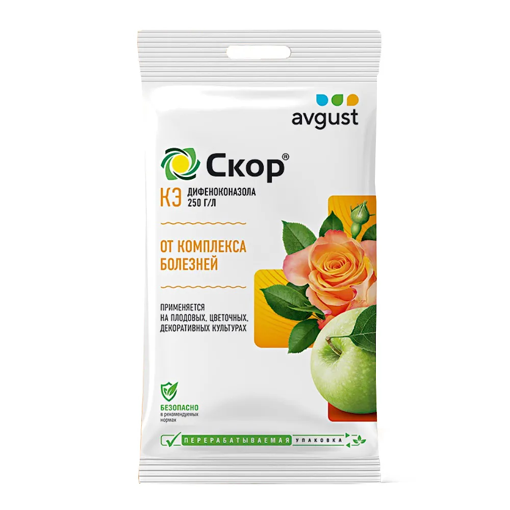 Средство от болезней плодовых и декоративных культур. Профилактическая защита и лечебное действие. Быстрое проникновение в растение, дождеустойчивость. Гибкие сроки применения на плодовых культурах. Защита культур на срок до 21 дня.