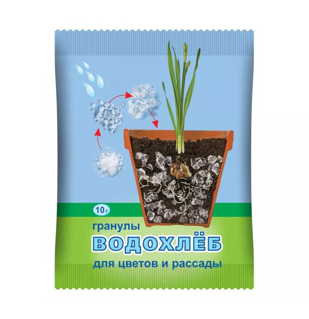 Гидрогель Водохлеб 10гр Ваше Хозяйство - это гранулы из гранулированного полимера акриламида, которые применяются при выращивании комнатных растений, рассады, а также в открытом и закрытом грунте.