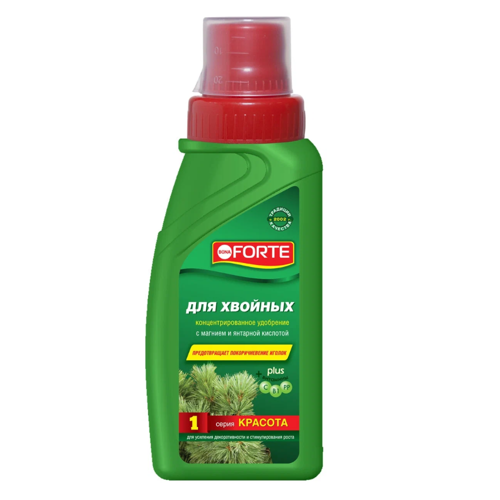Способ применения: При применении во флаконе с триггером отмерьте 5 мл концентрата и разведите в 1 литре воды. При использовании в опры- скивателе отмерьте 25 мл и разведите в 5 литрах воды. Опрыскивайте хвою до полного смачивания. У высоких взрослых растений можно опрыскать только нижнюю часть кроны, до которой возможно дотянуться. Не опрыскивать растения под прямыми солнечными лучами. Период применения: март - октябрь 1 раз в неделю.