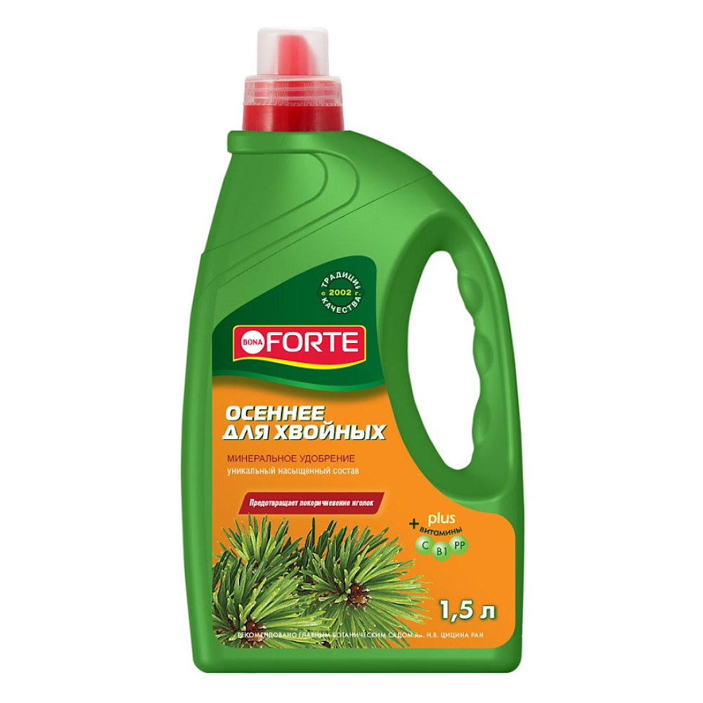 Универсальный объем 1,5 литра позволяет экономично использовать средство на протяжении всего сезона. Удобрение легко разводится в воде, не оставляет осадка и не засоряет поливочные системы. Продукт подходит для использования как в частных садах, так и на больших участках, где требуется поддерживать здоровье хвойных насаждений.