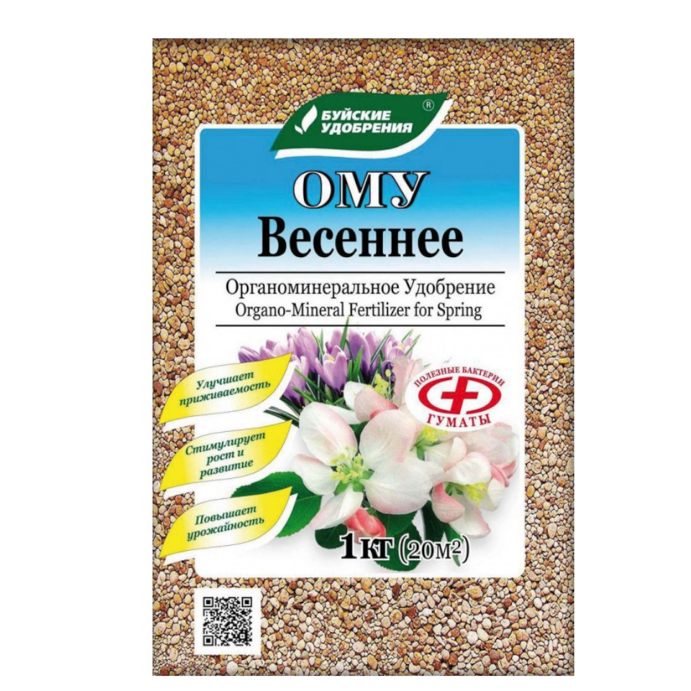 Удобрение ОМУ весеннее 1 кг - органоминеральное комплексное удобрение. Содержит макро- и микроэлементы, торф, гуматы, микробилогическую добавку. Дает полноценное минеральное питание растениям, стимулирует развитие корневой системы, повышает плодородие почвы и урожайность, улучшает качество и лежкость плодов. Предназначено в качестве основного удобрения при подготовке почвы к посеву (посадке), при составлении питательных субстратов для выращивания рассады, а также для подкормки овощных, плодовых, цветочных и декоративных культур в период вегетации.