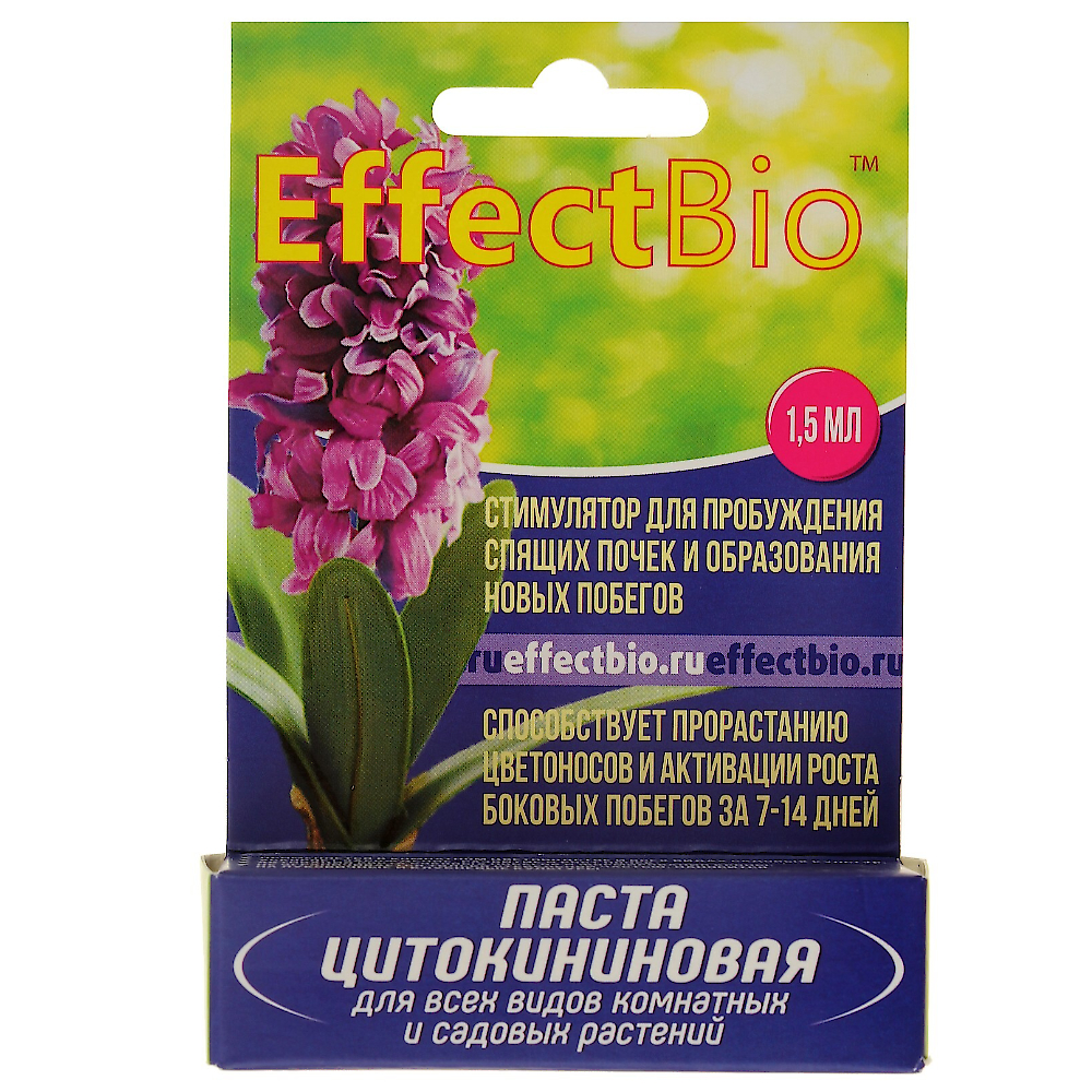 Паста цитокининовая “EffectBio™” 1,5 мл усовершенствованная для применения ко всем видам комнатных и садовых растений. Стимулятор для пробуждения спящих почек и образования новых побегов. Способствует прорастанию цветоносов и активации роста боковых побегов за 7-14 дней. Применяется в комнатном цветоводстве и всех видах садовых культур для ускорения зарождения, развития и роста почек, для активации роста боковых побегов и формирования кроны, а так же для стимулирования цветения и размножения растений. Применение пасты не ограничивается только стебельной частью. Наносить препарат можно и на луковичные или клубневые культуры. Ограничений по видам растений и применению не выявлено. Фирменная, красочная упаковка с подробным описанием по применению пасты, паста расфасована в пробирки.
