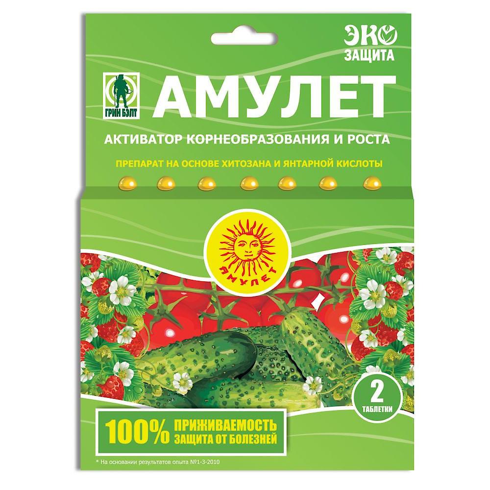 Стимулятор роста растений Амулет, 2 табл. - водорастворимый препарат в таблетированной препаративной форме на основе производимого из природного сырья вещества – хитозана, обладает иммуностимулирующей и антистрессовой активностью.
