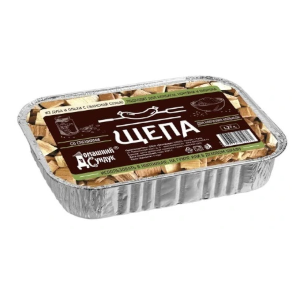 Щепа "Домашний Сундук" для копчения КОЛБАСОК в лот (дуб,ольха,сванская соль)1,27л ДС-363 подходит для использования на гриле, в коптильне и духовом шкафу. Предназначена для горячего и холодного копчения. Изготавливается из первосортного природного сырья, без химических примесей, не содержит кору и древесную пыль.