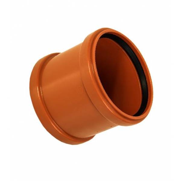 Муфта ремонтная Ø110 рыжего цвета используется в канализационных наружных сетях для соединения двух не имеющих раструба труб диаметром 110 мм.