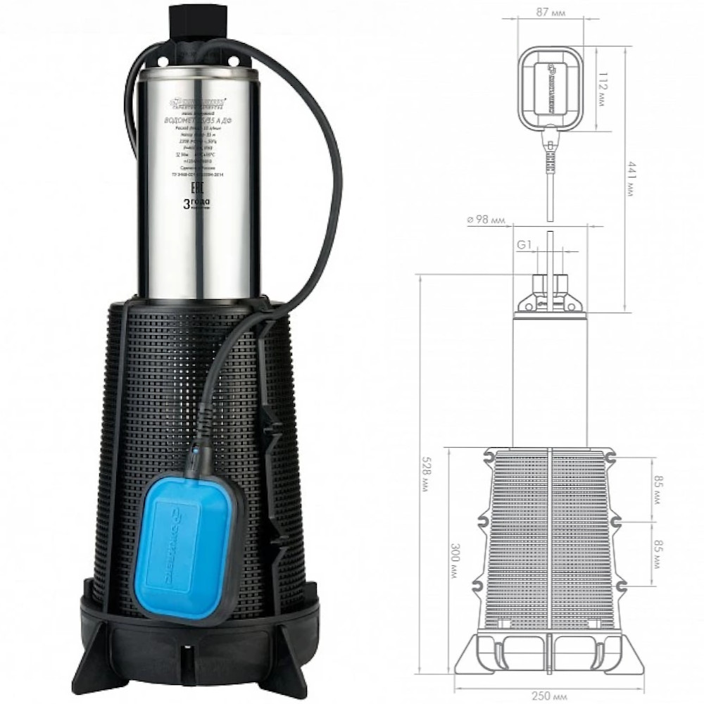 Колодезный насос с поплавковым выключателем, обладает максимальным расходом 55 л/мин (при свободном изливе, без подпора) и максимальным напором 35 метров (при закрытом кране). Диаметр насоса составляет 98 мм, а донного фильтра 250 мм. Конструкция донного фильтра обеспечивает дополнительную защиту от засорения, даже при установке насоса на дно источника. Охлаждение двигателя производится перекачиваемой водой, проходящей между корпусом насоса и корпусом электродвигателя. Термореле защищает электродвигатель от перегрева. Встроенный конденсатор позволяет использовать 3-х жильный провод вместо 4-х жильного. Конструкция насосных ступеней позволяет перекачивать воду, содержащую во взвешенном состоянии до 2 кг/м3 песка. Внешний вид, цветовая гамма, технические характеристики товара и комплектность могут отличаться от реальных,уточняйте сведения на момент покупки и оплаты.