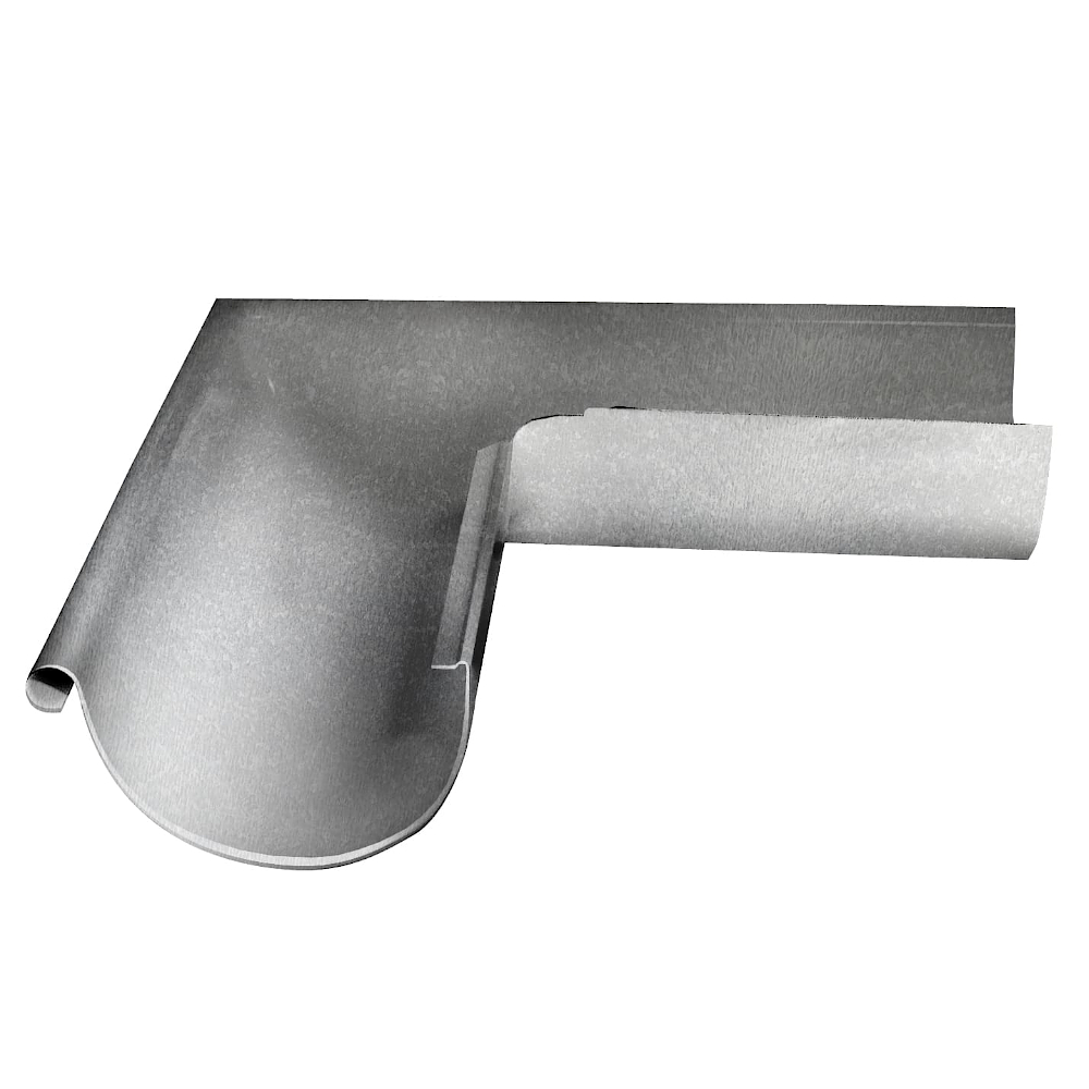 Угол желоба внешний устанавливается под скатом кровли на внешних углах здания. Предназначен для смены направления движения воды в стоке на 90 °, для обеспечения непрерывности линии желобов на внешних углах здания и для уменьшения количества стояков и водосточных труб. Для соединения фрагментов желоба предусмотрена возможность вставки друг в друга. Угол изготовлен из оцинкованной стали. Материал прочный и устойчивый к износу, покрытие защищает от воздействия влаги и температур. Для предотвращения разбрызгивания воды рекомендуется устанавливать на угловые элементы ограничители перелива.